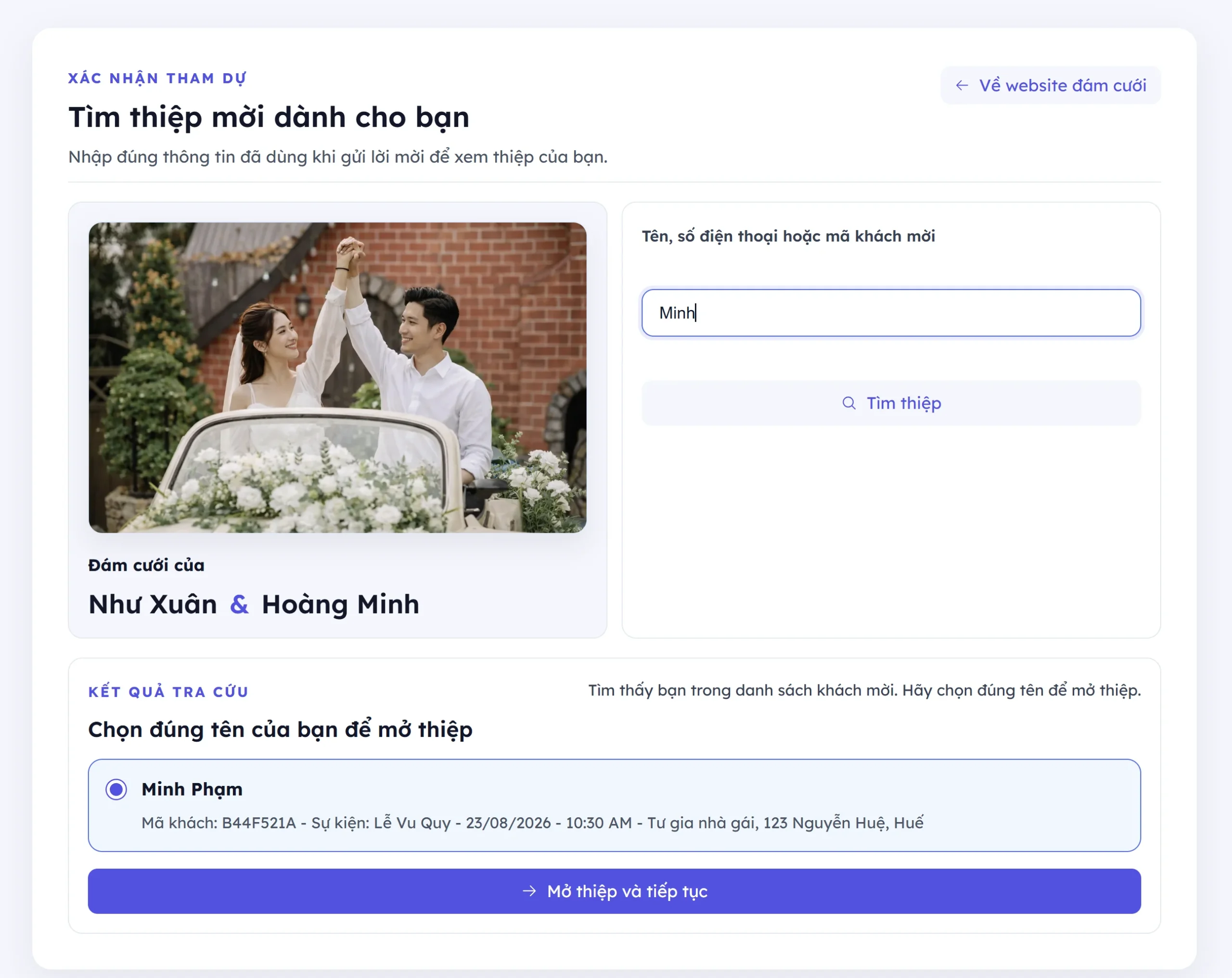 • Khi thêm khách mời vào trong danh sách khách mời từ giao diện có thể tra cứu theo tên hoặc số điện thoại để hiển thị thiệp mời theo tên bạn đã thêm vào. Bên dưới là ảnh minh họa:
