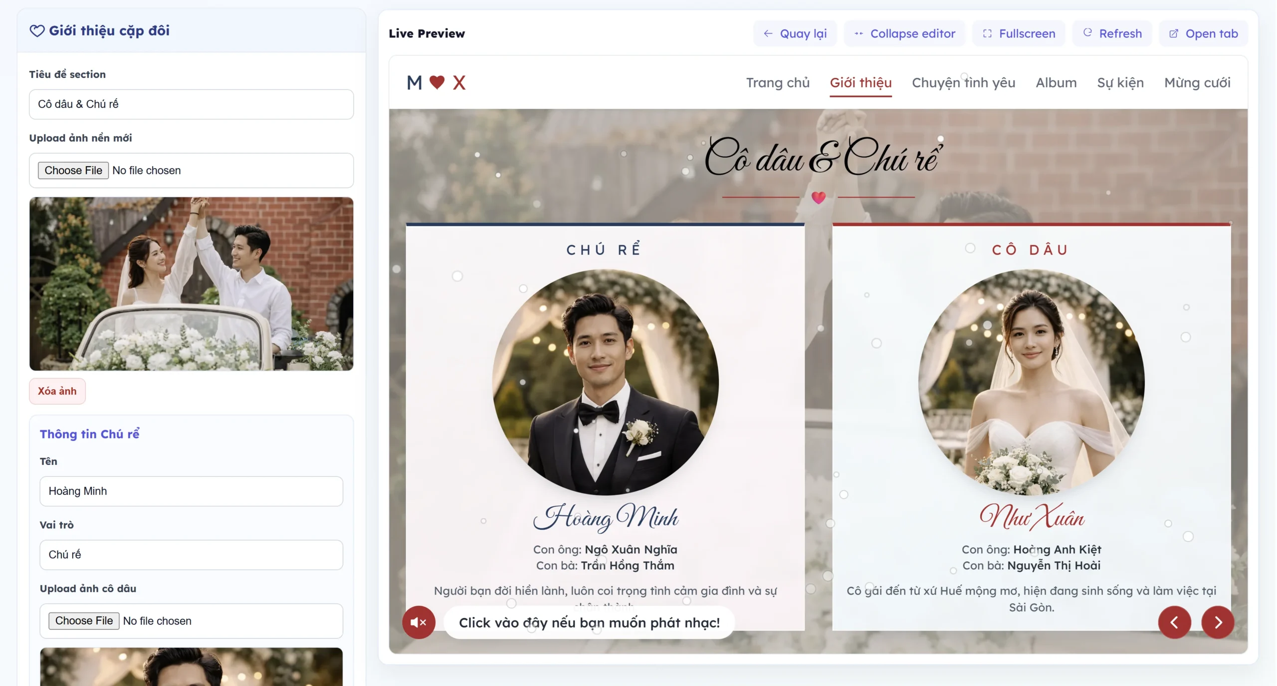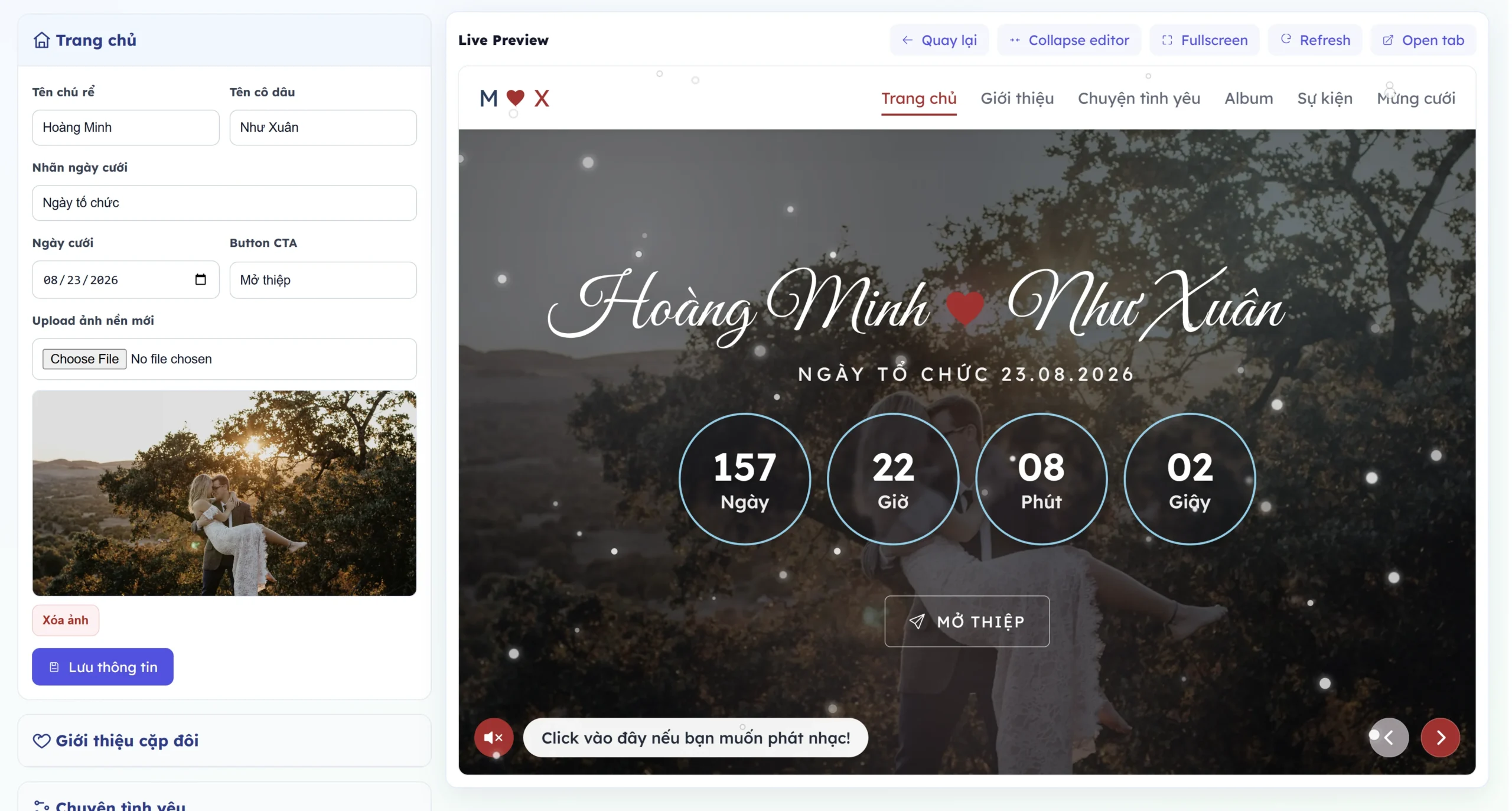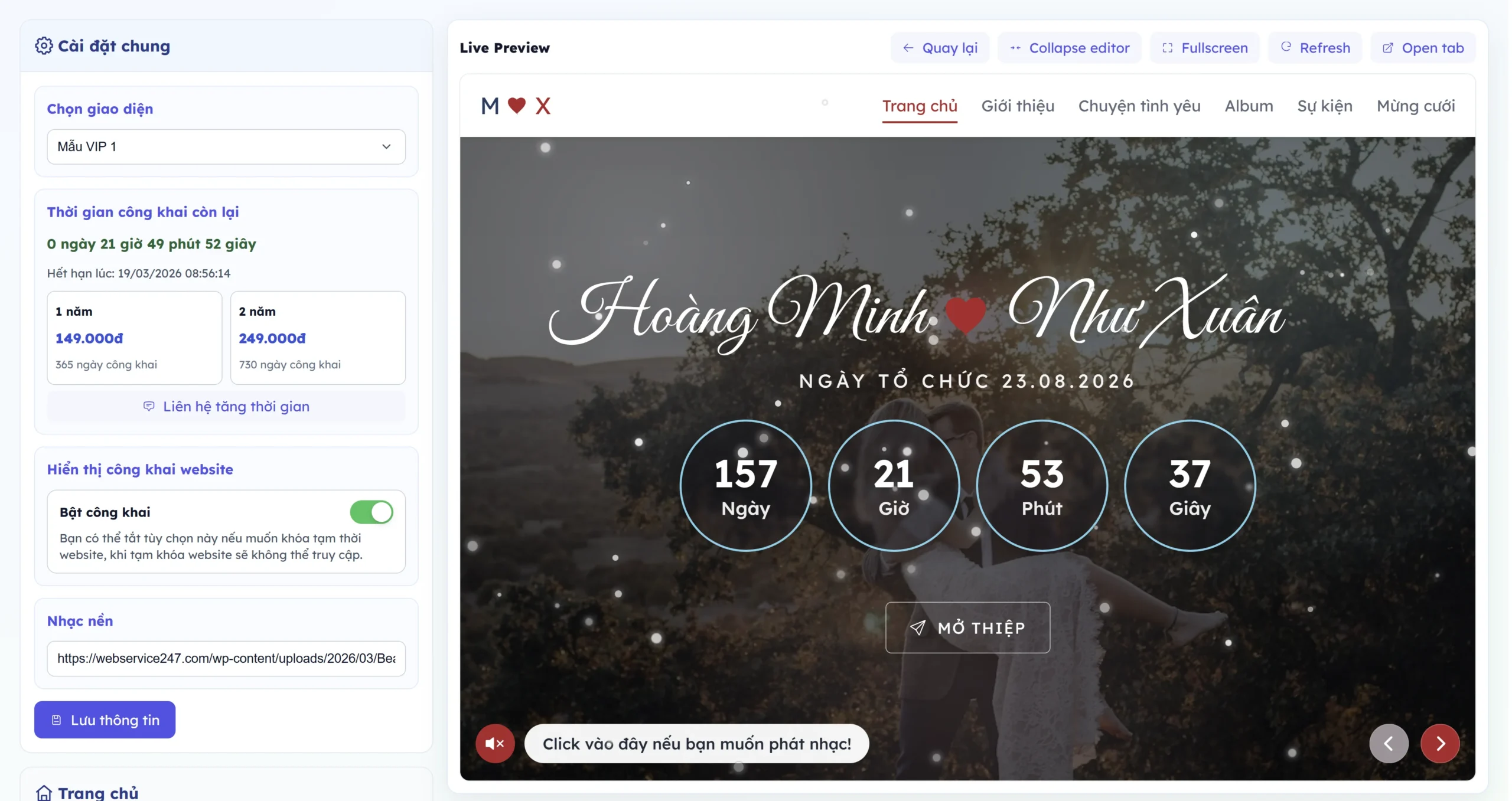 • Sau khi nhấn vào tạo ngay thì bạn có thể truy cập ngay trang thiệp cưới của mình với các thông tin cơ bản.