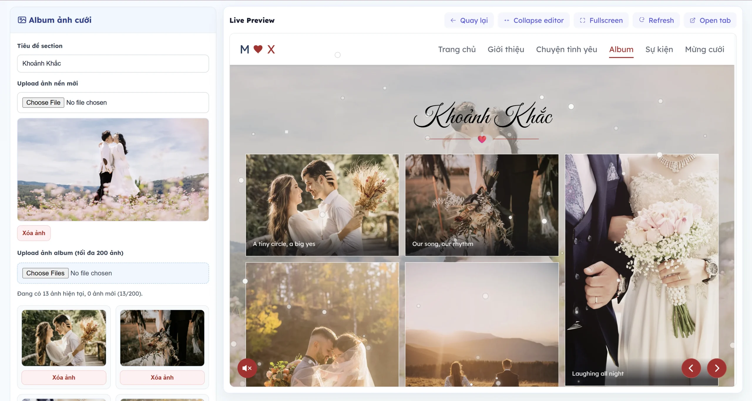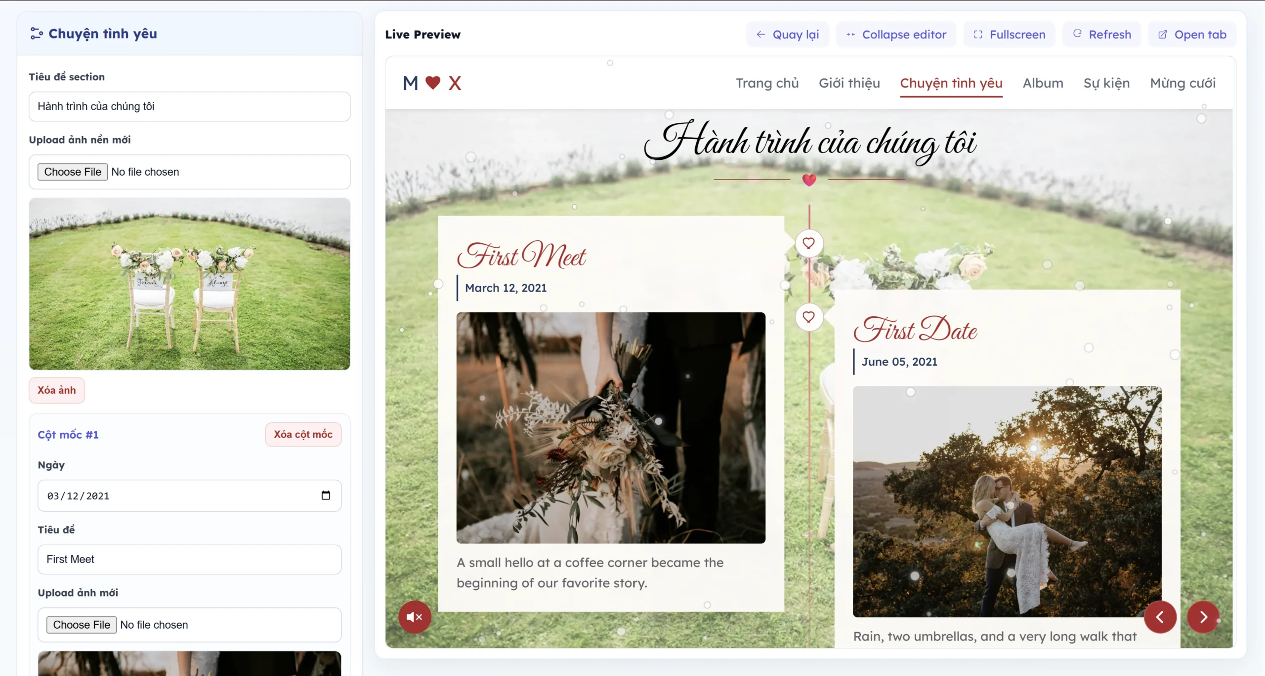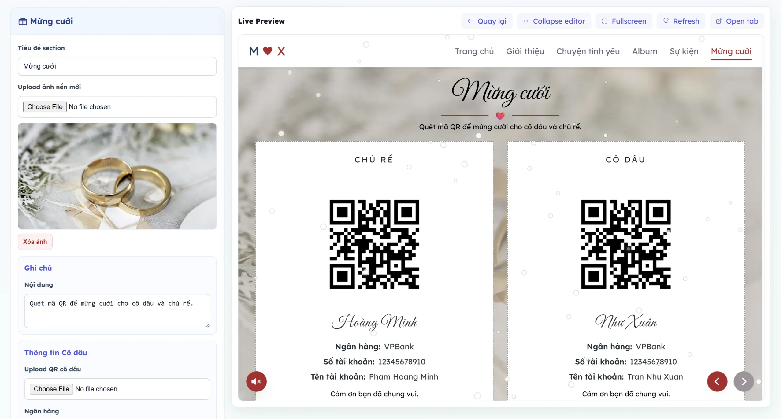 • Sau khi nhấn vào tạo ngay thì bạn có thể truy cập ngay trang thiệp cưới của mình với các thông tin cơ bản.